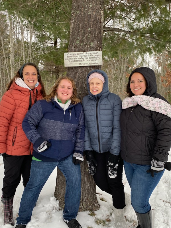 4 girls standing by a tree dressed in winter clothes